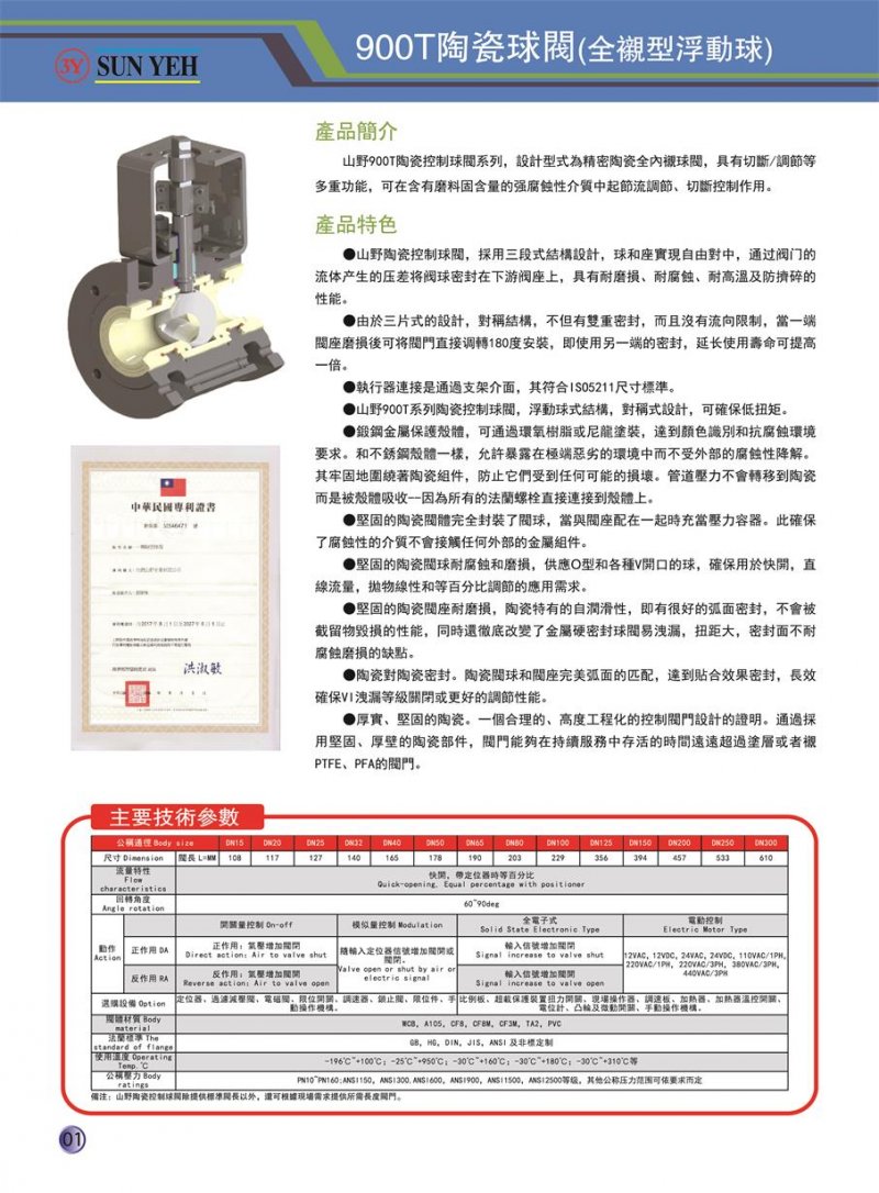 山野900T陶瓷控制球闀系列,设計型式為精密陶瓷全內襯球同,具有切断/調節等多重功能,可在含有磨料固含量的强腐触性介中起節流调節、切断控制作用。